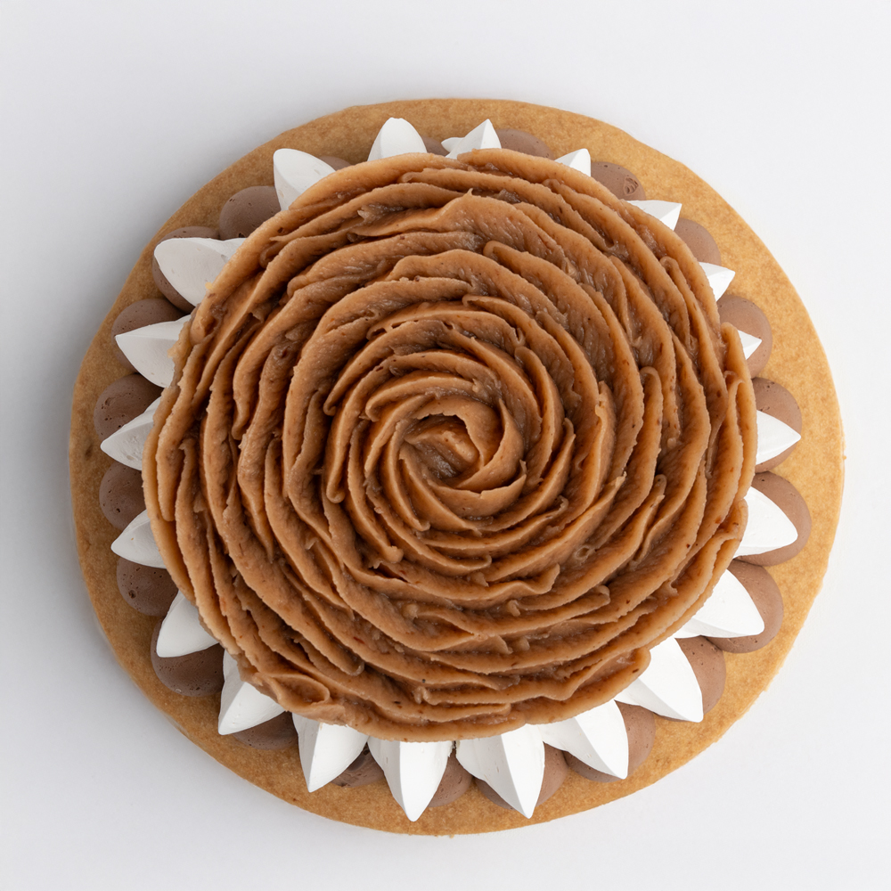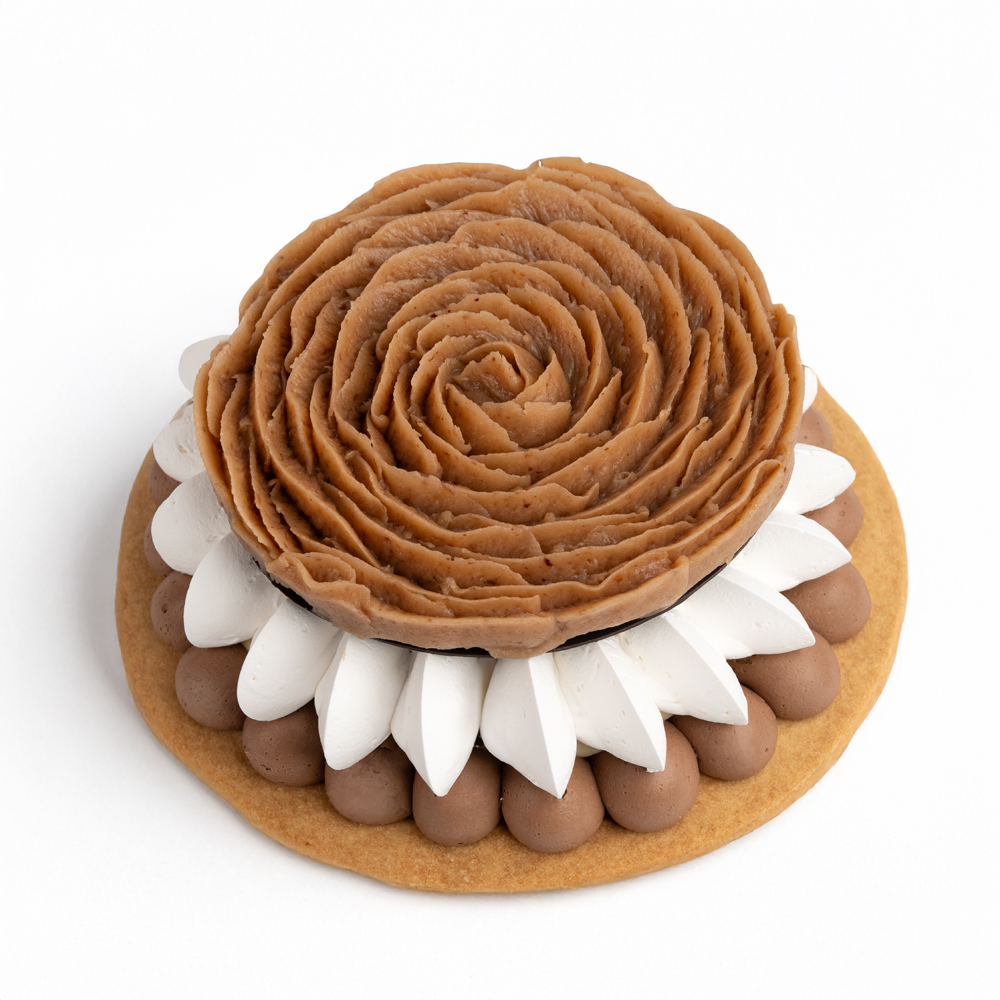 Tereyağlı özel Five O'Clock tart tabanı, Five O'Clock çikolata kreması, kestane şekerleri ve ezmesi, beze